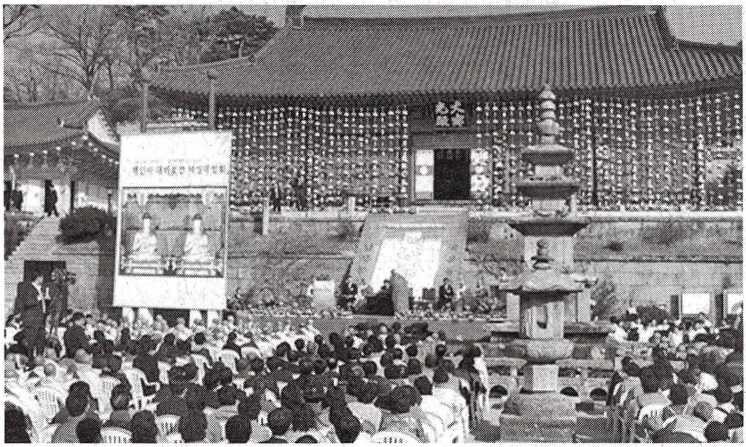 낙성법회에는 조계종 종정 법 전스님과 총무원장 지관스님을 비롯해 사부대 중 2천여 명이 참석해 대비로 전 낙성을 축하 했다.